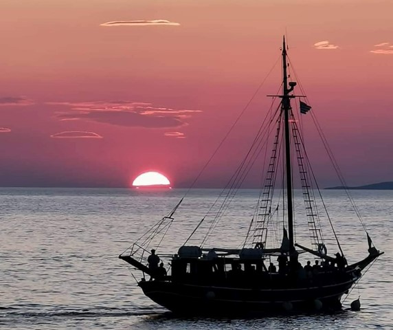 Coctel a la puesta de sol en Caique tradicional, Mykonos.. El embarque se hace desde la playa con una lancha desde la arena a las 18h00 y navegaremos por la costa sur hasta los alrededores de Pequena Venecia, donde la goleta permanecerá anclada. Disfrutaremos de una barra libre a bordo hasta la puesta del sol, con posibilidad de snacks y música para convertir la experiencia en una fiesta!